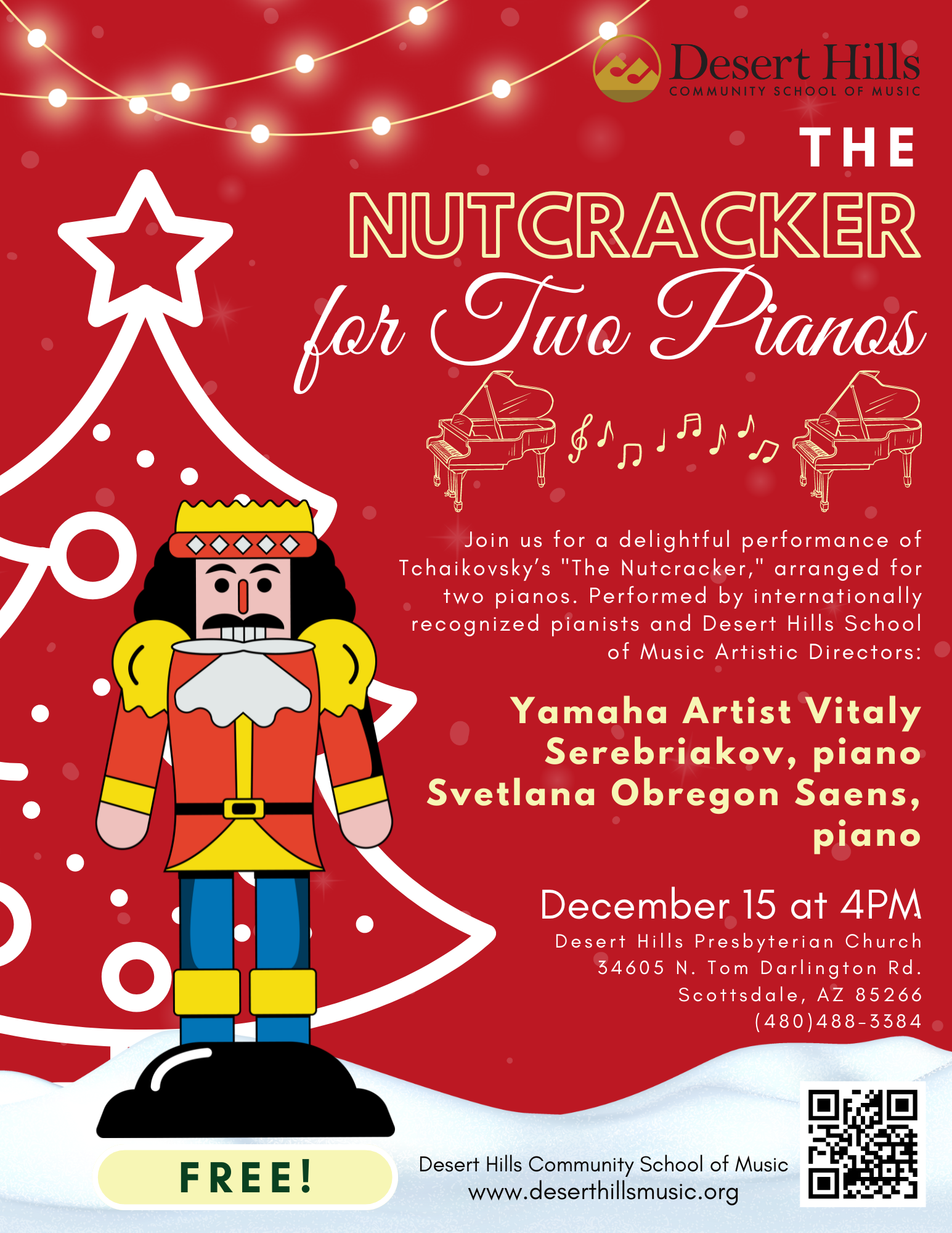Join us for a delightful performance of Tchaikovsky's "The Nutcracker," arranged for two pianos. Performed by internationally recognized pianists and Desert Hills Community School of Music Artistic Directors.